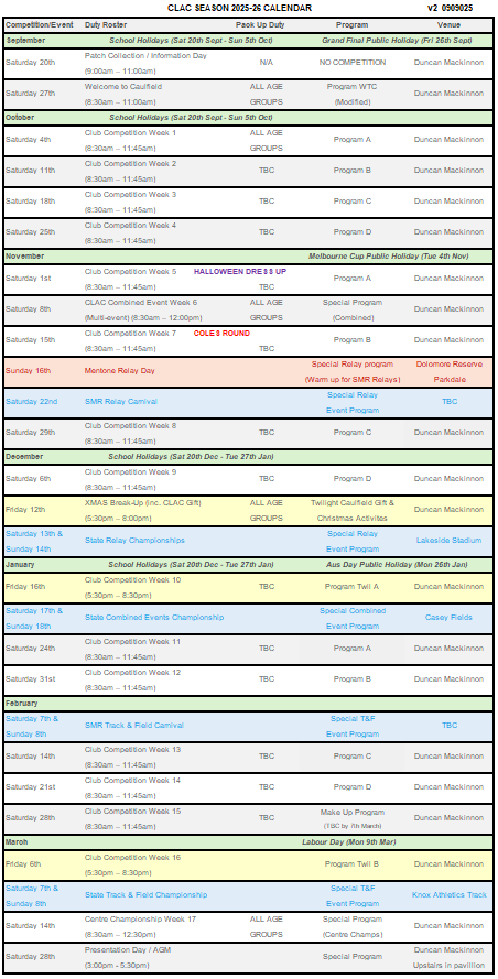 This calendar is a guide only and is subject to change. Please check your weekly emails for up to date information, including starting times and event programs.