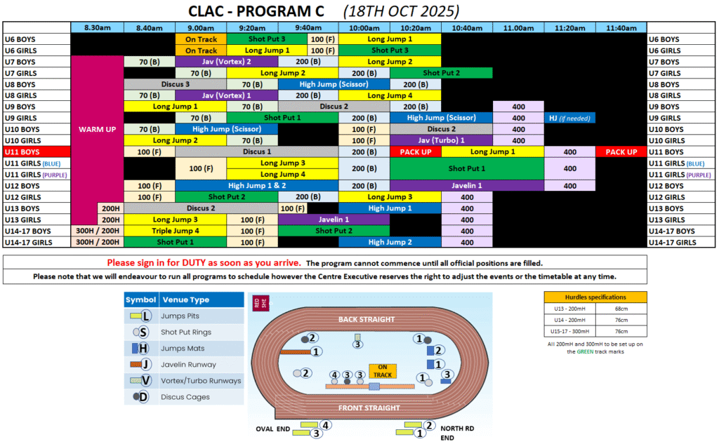 This season we will be running four (4) programs A, B, C, D which will rotate each week on Saturdays. We also have three (3) Twilight programs this season. The programs will be listed below and whilst not giving details of the event order or event timing, it will provide a view of which events will be happening in each program for each age group. The final program for each week’s competition will be uploaded here on the Sunday evening prior, as well as on our Facebook page and on Team App.